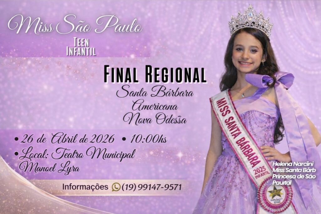 As cidades da região terão, no próximo domingo, dia 26, um encontro com a passarela no Teatro Manoel Lyra, em Santa Bárbara d’Oeste, onde acontece a final que vai escolher misses, princesas e mister entre crianças e adolescentes de diferentes municípios. Com início marcado para as 10h, o evento integra o circuito regional infantojuvenil e destaca critérios que vão além da beleza, como carisma, postura, comunicação e presença de palco.